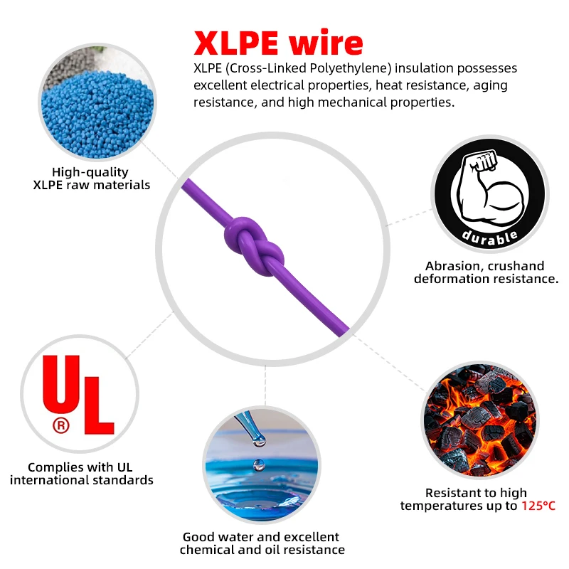 XLPE insulated hook-up wire has superior properties to polyvinyl chloride (PVC) and standard polyethylene insulation. The most obvious one is that XLPE does not soften or degrade except at high temperatures. You can use XLPE insulated wire at temperatures up to 125 degrees Celsius, and some types will go even higher. The material has superior fire-retardant properties. |