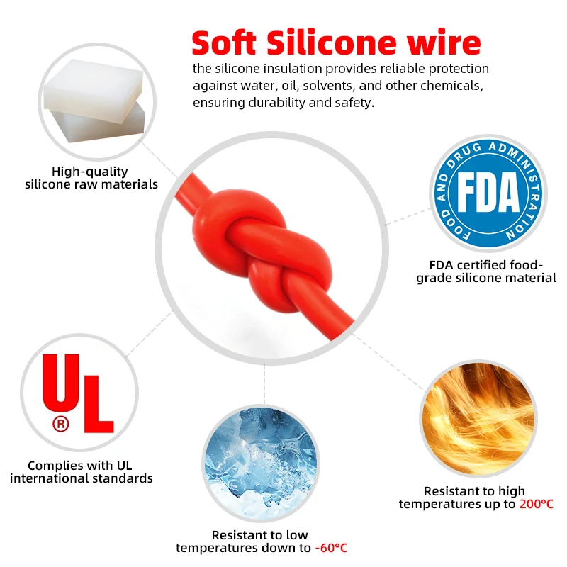 Made of virgin silicone material that is chemically resistant, weatherproof, flame retardant, and moisture resistant to meet the stringent standards of VW-1 fire ratings, with a temperature range of -60°C to 200°C |