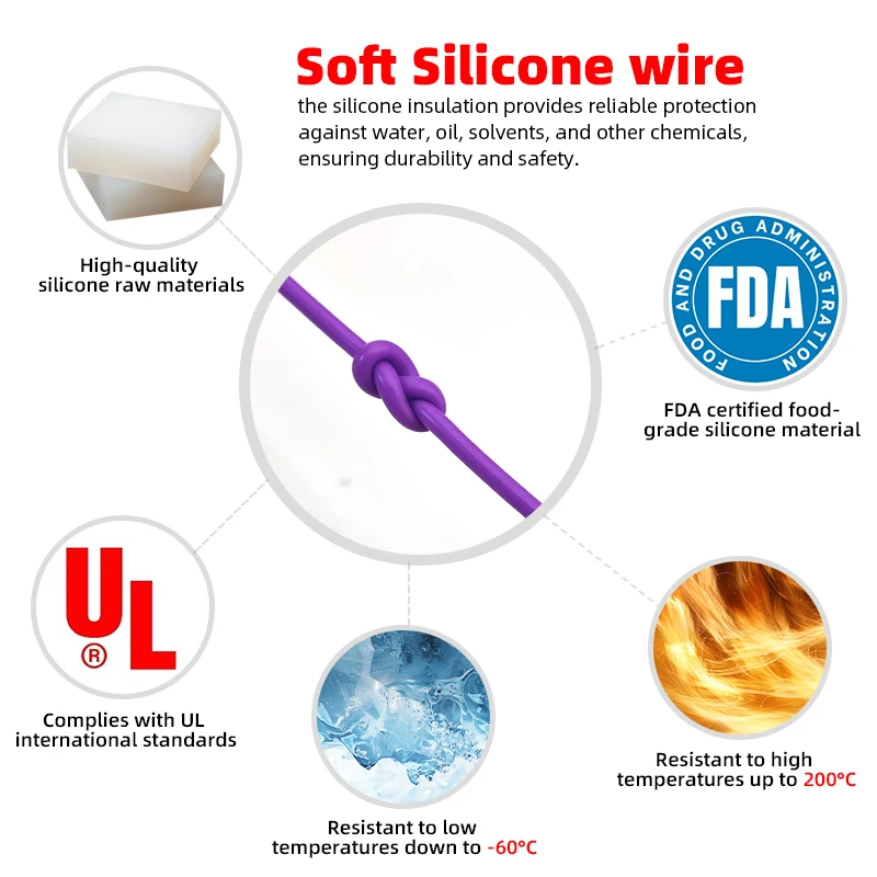 Made of virgin silicone material that is chemically resistant, weatherproof, flame retardant, and moisture resistant to meet the stringent standards of VW-1 fire ratings, with a temperature range of -60°C to 200°C |