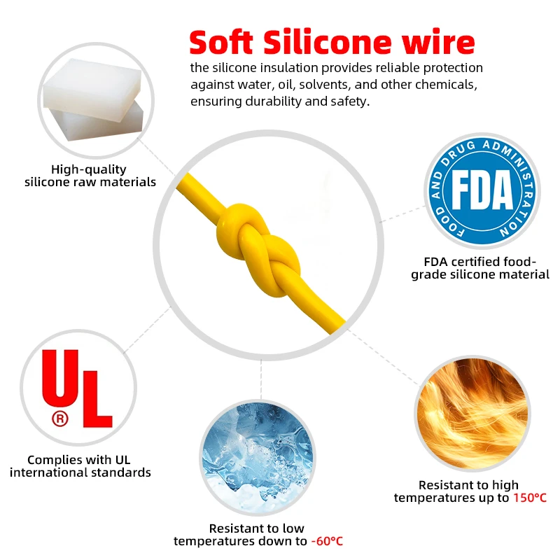 Made of virgin silicone material that is chemically resistant, weatherproof, flame retardant, and moisture resistant to meet the stringent standards of VW-1 fire ratings, with a temperature range of -60°C to 150°C |