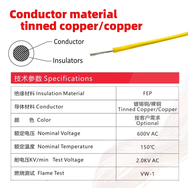 UL1331 Custom 600V AC Single ROHS Wire Cable Tinned Copper 14 30AWG FEP Insulation Stranded Nickel for Bare Construction