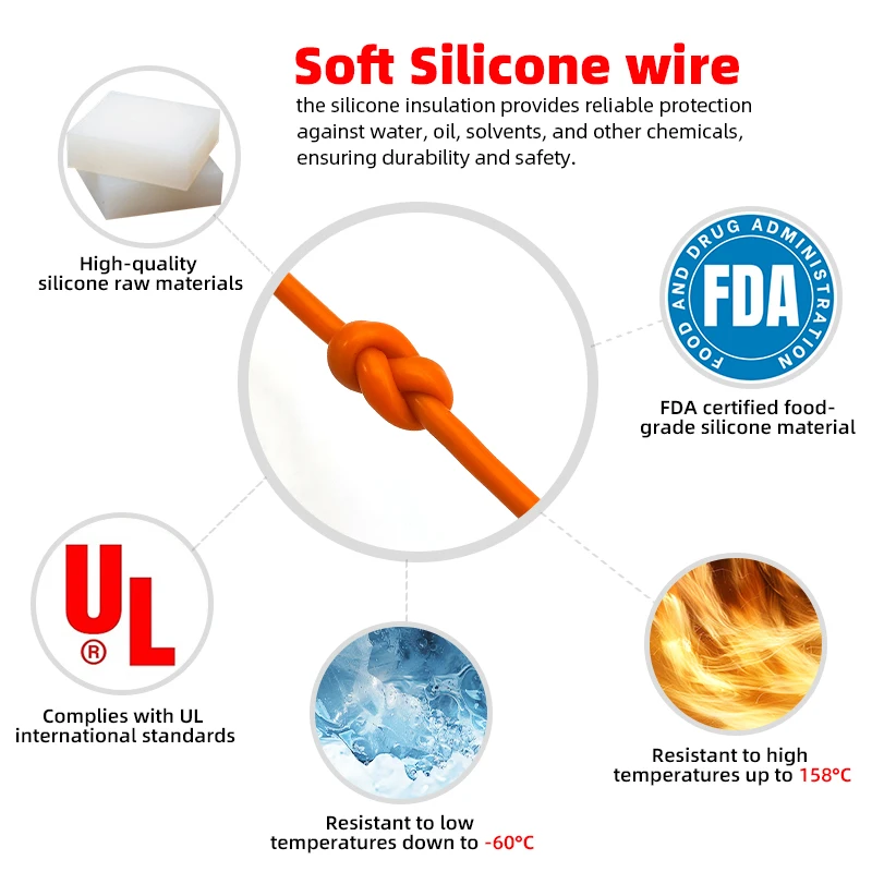 Made of virgin silicone material that is chemically resistant, weatherproof, flame retardant, and moisture resistant to meet the stringent standards of VW-1 fire ratings, with a temperature range of -60°C to158°C |